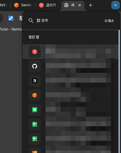 버튼을 누르면 아래그림 처럼 현재 창의 탭이 아니라 열려 있는 모든 탭과 최근에 닫았던 탭까지 리스트로 보여준다.