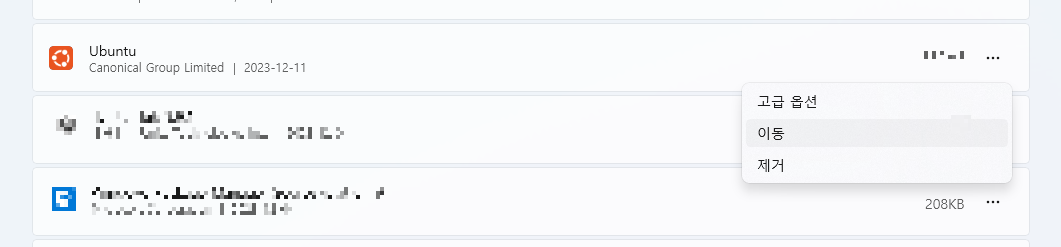 - 시스템 설정에서 설치된 앱 중 우분투를 하드 디스크로 이동하는 방식으로 해결을 시도하였으나 실패 함