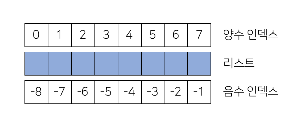 리스트의 데이터 숫자가 변하는 경우 가장 마지막 인덱스는 알기가 힘들다. 물론 len명령으로 전체 리스트의 데이터 수를 파악할 수 있지만 필요할 때마다 명령을 써야 하는 번거로움이 있다. 이때 필요한 것이 음수 인덱스이다. 리스트는 맨앞에서 0부터 시작한다. 그런데 맨 마지막을 표현하는 음수 인덱스로 -1을 사용한다. -2는 마지막에서 하나 이전 위치를 나타내게 된다.